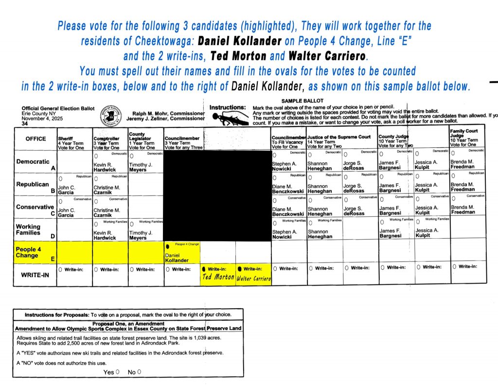 There are 14,300 unaffiliated, “BLANK” voters in Cheektowaga, and we encourage all of you to come out and vote in 2025. We invite any registered Cheektowaga voter, regardless of party affiliation, to vote for Dan Kollander on the People 4 Change line on November 4, 2025!
